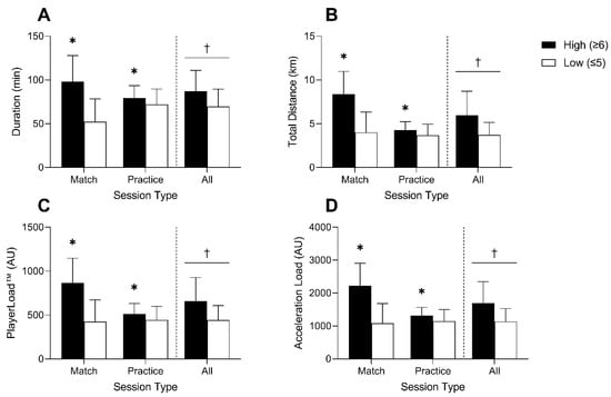Session duration (A), total distance traveled (B), PlayerLoad™ (C), and acceleration load (D) data stratified by high (≥6) or low (≤5) perceived session exertion for matches, practices, and all sessions. * Significant difference between high and low exertion session within session type (p < 0.001); † Significant main effect of session exertion (p < 0.001).