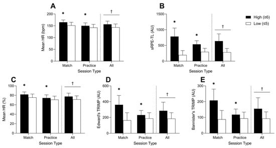 Mean absolute HR (A), sRPE-TL (B), mean relative HR (C), Edward’s TRIMP (D), and Bannister’s TRIMP (E) data stratified by high (≥6) or low (≤5) perceived session exertion for matches, practices, and all sessions. * Significant difference between high and low exertion session within session type (p < 0.001); † Significant main effect of session exertion (p < 0.001).