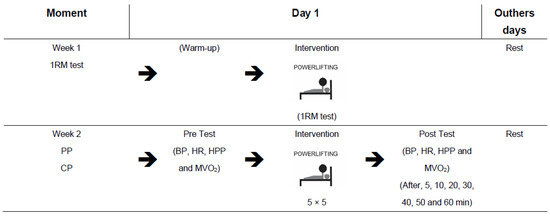 Experimental design—weekly schedule of the tests and intervention. BP: blood pressure, HR: heart rate, HPP: heart pressure product, MVO2: myocardial oxygen volume, PP: Paralympic powerlifting. CP: conventional powerlifting, 5 × 5: five series of five maximum repetitions.