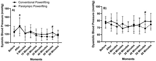 In PP, however, there would be a need to increase blood accumulation in the activated region, promoting increased vasodilation and reduced peripheral vascular resistance, providing PHE [40], and considering that training tends to use multiarticular exercises, which normally involve large muscle groups, increasing the PHE. In a study that evaluated the hypotensive effects in Paralympic athletes, no differences were observed between the two training sessions with different intensities, without significant interaction (training vs. time), and there was an increase in SBP immediately after training at both intensities, followed by a decrease to levels below resting values from 20 to 50 min after resistance training [2]. Other studies have presented similar results between conventional and Paralympic athletes in the bench press exercise of powerlifting [28,43,44].