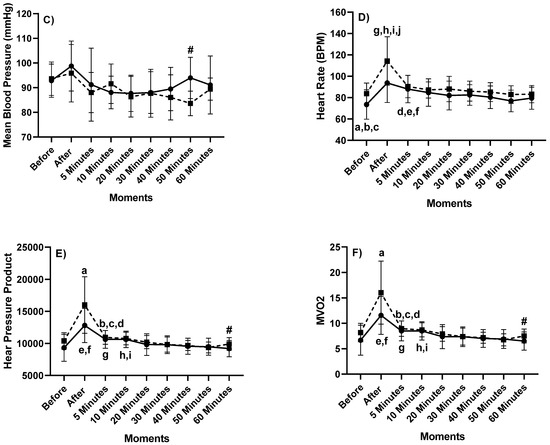 Kinetics of (A) systolic blood pressure (SBP), (B) diastolic blood pressure (DBP), (C) mean blood pressure (MBP), (D) heart rate (HR), (E) heart pressure product (HPP), and (F) MVO2. Legend: letters “a–j” indicate intraclass differences, and “#” indicates interclass difference (p < 0.05).