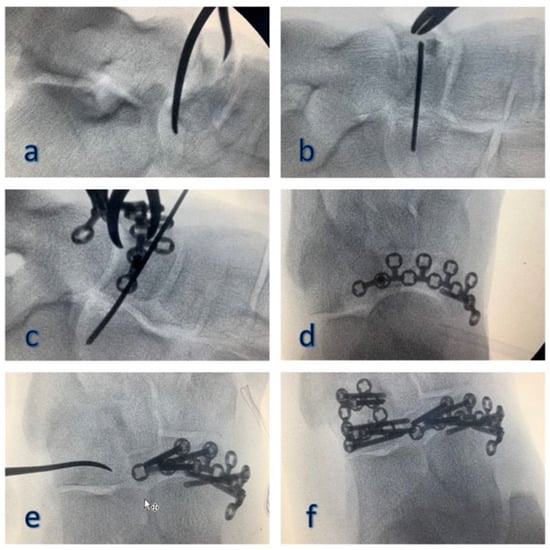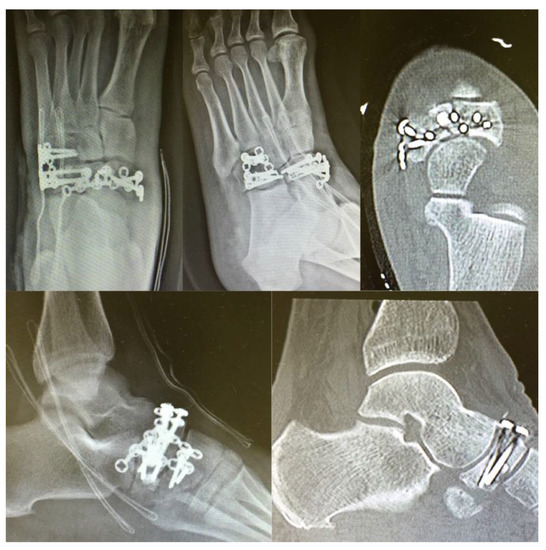 At the end of the procedure, we checked the stability of fragments, confirming the good firmness of the synthesis and the absence of any subluxation. In conclusion, the foot was immobilized with a splint, and postoperative X-rays analysis and CT scan were executed (Figure 4).