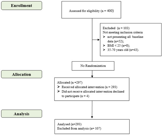 From January 2011 to February 2014, a total sample of 293 (Figure 1) overweight/obese adults (165 women and 128 men, mean age 51.9 ± 9.5 years and 54.6 ± 8.3 years, respectively) with and without DM2 were recruited at the C.U.R.I.A.Mo. center to follow an intensive and multidisciplinary intervention protocol, as described by De Feo et al. [25].