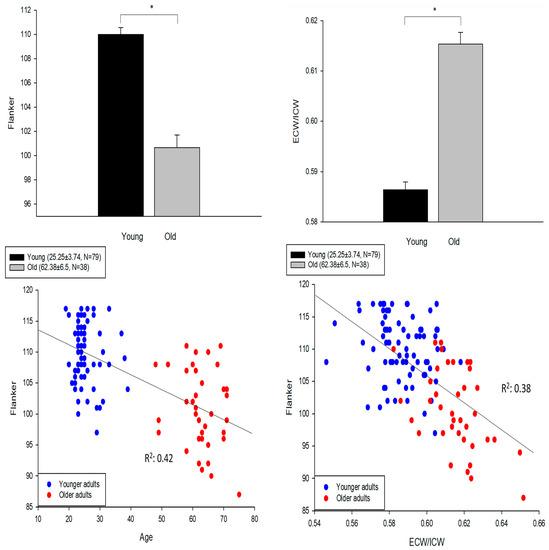 Upper left: Younger adults (n = 79) had higher Flanker test scores as compared with the older adults (t = 8.69, df = 115, and * p < 0.01; error bar: SE). Upper right: Younger adults had lower extracellular to intracellular water ratio (ECW/ICW) than the older adults (t = −10.71, df = 115, * p < 0.01). Lower left: A significant association between age and Flanker test (R2 = 0.42; p < 0.01). Lower right: A significant association between ECW/ICW and Flanker test (R2 = 0.38; p < 0.01).