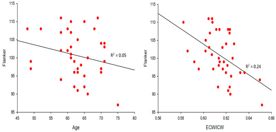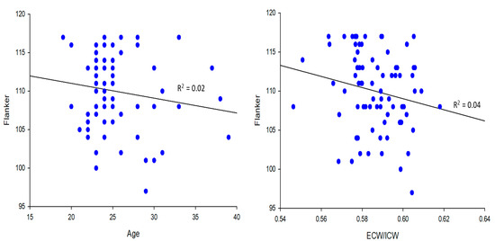 The Figure 2 upper panels show that there was no correlation between age and the Flanker test scores (R2 = 0.02; p > 0.05) and between the ratio of extracellular/intracellular water and the Flanker scores in the younger group (R2 = 0.04; p > 0.05).