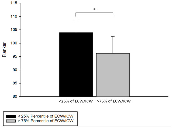 Less than 25% of extracellular/intracellular ratio (ECW/ICW) in older participants had higher Flanker test scores as compared with more than 75% of ECW/ICW in older participants (t = 3.013, df = 17, and * p < 0.01).