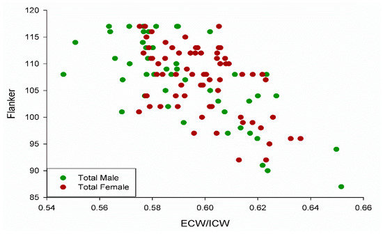 Scatterplot depicting the similar distribution between males and females in the study with R2 = 0.38, 0.51, and 0.25 for the total group, male group, and female group, respectively (all p < 0.05), for Flanker scores relative to extracellular/intracellular ratio (ECW/ICW).