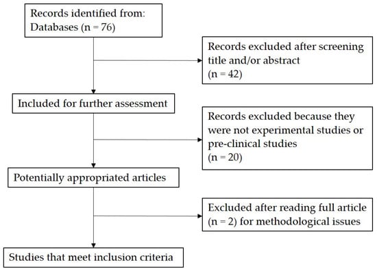 The initial search yielded 76 articles, of which 34 were identified as relevant after screening of titles/abstract. Twenty records were excluded because they were not experimental studies or pre-clinical studies. Two papers were excluded after reading full article for methodological issues.