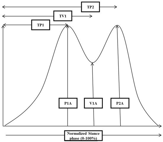 A schematic drawing of a normal GRF-curve is presented to demonstrate which parameters were extracted for further analysis: the amplitude of peak 1 (P1A), the amplitude of valley 1 (V1A), and the amplitude of peak 2 (P2A). To determine the onset and end of the stance phase, those timing points were chosen where the GRF-curve crossed the force level of 5% of peak amplitude. Thereafter, time to P1 (TP1), time to V1 (TV1), and time to P2 (TP2) were determined (for further details, see Section 2).