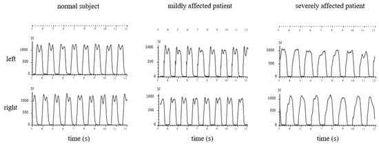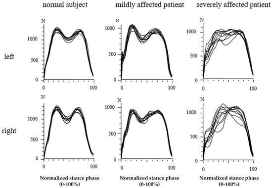 In Figure 4, the GRF-curves of the left (upper part) and the right foot (lower part) of the same subject and patients as in Figure 3 are superimposed with the time normalized stance phase. The more affected the patient, the slower he walks, the higher the variability of the individual steps, and the less clear the “heel-on-midstance-toe off” modulation of the CRF-curves. In the severely affected patient (Figure 3 and Figure 4 right side), the typical shape of the GRF-curve with two distinguishable peaks is missing.