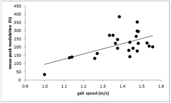 Gait speed did not correlate with the difference PD1 (r = 0.339; n.s.), but did correlate with PD2 (see Figure 5; r = 0.412; p < 0.045) and the mean value (PD1 + PD2)/2 (r = 0.438; p < 0.032).