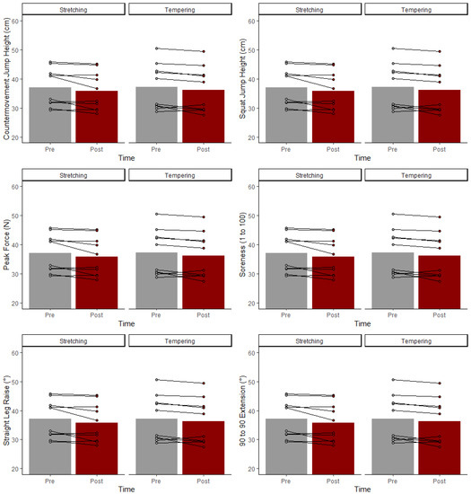 | Soreness (mm) | Tempering Stretching | 43.0 ± 26.66 43.4 ± 16.89 | 23.90 ± 14.16 37.9 ± 17.51 | 42.06 10.99 | −0.94, large −0.44, small |