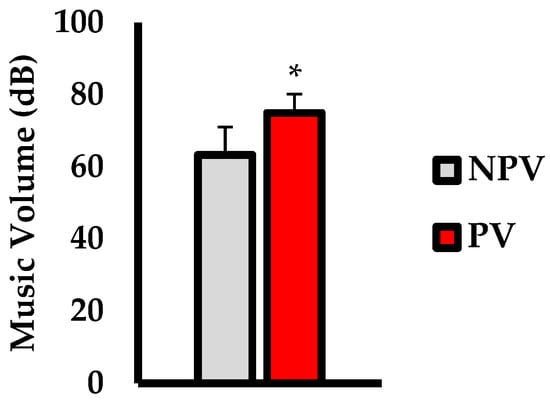Average music volume chosen in decibels (dB) between non-preferred volume (NPV) and preferred volume (PV) conditions. Data are presented as mean ± SD. * indicates significantly different than NPV (p < 0.05).