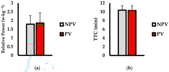 Comparisons of (a) relative power output (w·kg−1), (b) time to completion (TTC; min) between non-preferred volume (NPV) and preferred volume (PV) conditions. Data are presented as mean ± SD.