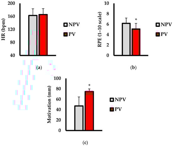 Analysis of psychophysiological outcomes are shown in Figure 3. No differences in HR (bpm; Figure 3a) were observed (p = 0.956; d = 0.08). For RPE (1–10 scale; Figure 3b), PV resulted in significantly lower ratings compared to NPV (p = 0.002; d = 0.86). Furthermore, motivation to exercise (mm; Figure 3c) was significantly higher (p < 0.001; d = 2.14) during the PV condition versus NPV.