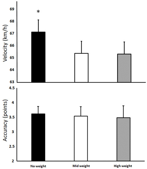 Mean values and standard deviations for maximal throwing velocity and accuracy in the three conditions. ∗ Indicates a significant difference from all other weights (p ≤ 0.05).