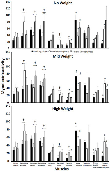 Mean values and standard deviations in EMG in the muscles with no, mid and high weight in the arm cocking, arm acceleration and follow-through phases. † Indicates significant difference between the marked phases (p ≤ 0.05). ∗ Indicates a significant difference between all of the other phases (p ≤ 0.05).