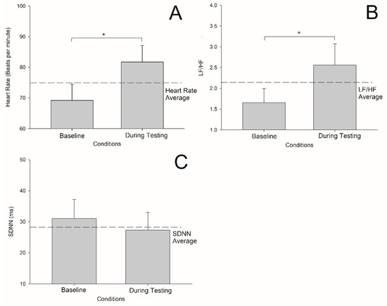 HR, LF/HF, and SDNN comparison analyses between two conditions (baseline and during testing) were conducted. (A) HR during testing was higher than baseline HR (p = 0.01). (B) LF/HF during testing was higher than baseline LF/HF (p = 0.03) (C) SDNN during testing was not significantly lower than baseline SDNN. (p = 0.8). * p < 0.05.