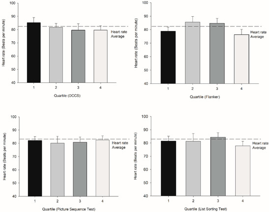 Upper left: Quartile comparisons (determinants: DCCS) in terms of heart rate (error bar: SE) did not demonstrate any significant differences. Upper right: Quartile comparisons (determinants: Flanker) in terms of heart rate did not demonstrate any significant differences. Lower left: Quartile comparisons (determinants: Picture Sequence) in terms of heart rate did not demonstrate any significant differences. Lower right: Quartile comparisons (determinants: List Sorting) in terms of heart rate did not demonstrate any significant differences.