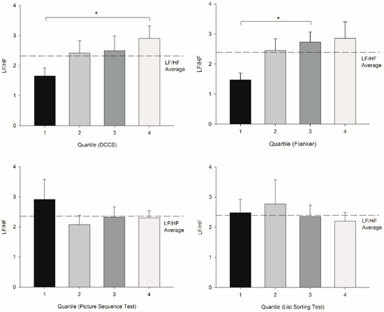 Upper left: Quartile comparisons (determinants: DCCS) in terms of LF/HF (error bar: SE) demonstrate that there was a significant difference between quartile 1 and quartile 4. (U = 55, and * p = 0.007) Upper right: Quartile comparisons (determinants: Flanker) in terms of LF/HF demonstrate that there was a significant difference between quartile 1 and 3 (U = 35, and * p = 0.004 for quartile 1 and quartile 3) Lower left: Quartile comparisons (determinants: Picture Sequence) in terms of LF/HF did not demonstrate any significant differences. Lower right: Quartile comparisons (determinants: List Sorting) in terms of LF/HF did not demonstrate any significant differences.