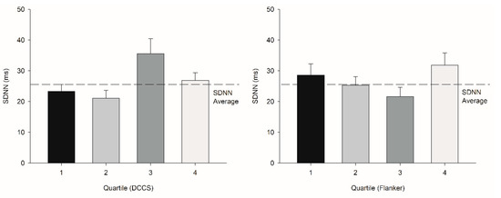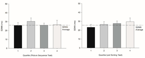 There were no differences among the quartile groups for age, height, weight, BMI, or activity level for Picture Sequence, DCCS, Flanker, and List Sorting (p = −0.6, 0.5, 0.3, 0.3, and 0.9 for Picture Sequence; 0.3, 0.5, 0.7, 0.9, and 0.3 for DCCS; 0.1, 0.5, 0.8, 0.9, and 0.7 for Flanker; and 0.1, 0.5, 0.3, 0.7, and 0.2 for List Sorting, respectively). There were no differences for HR, SDNN, and LF/HF among the quartiles for Picture Sequence (HR: t = −0.0929, df = 60, p = 0.926, SDNN: U = 409, p = 0.3, LF/HF: U = 438, p = 0.6, respectively) and List Sorting (HR: t = 0.008, df = 60, p = 0.9, SDNN: U = 393, p = 0.4, LF/HF: t = 0.3, df = 0.8, p = 0.8, respectively) (Figure 2, Figure 3 and Figure 4).