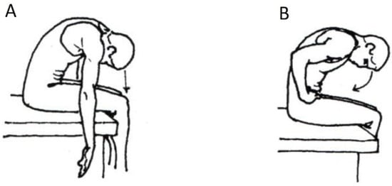 (A) Mobility test of the trunk with flexion of the head and pelvic tilt (rotation), and (B) without the pelvis tilted forward.