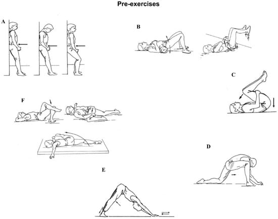 Pre-exercises that were performed prior to the testing procedure. (A): Pelvic tilting in upright position by flattening back and sliding up and down against a wall, to initiate the concept of proper bending and squatting. (B): Gentle rotation and elevation of the pelvis forward and backward. Feet on the floor and wall. (C): Both knees towards the chest into a fully flexed position, the lumbar spine pressed to the floor. (D): Stretching the iliopsoas muscle. (E): Stretching the hamstrings and gastrocnemii muscles. (F): Stretching the obliqui and muscles around the pelvis.