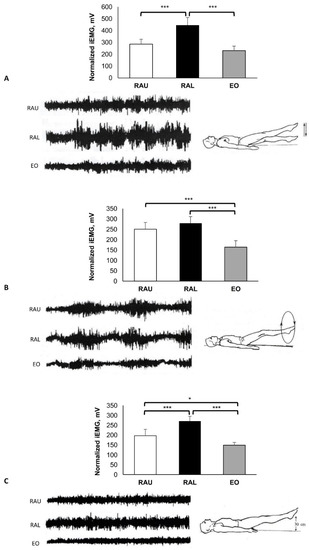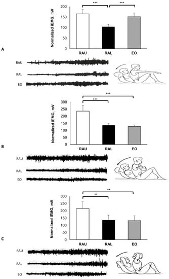 During the eccentric exercises (Figure 8A), the EMG activity increased more at the end of the movement, when the subject approached the mat. Higher EMG activity was found in the RAU (165.43 ± 20.92 mV) compared with the RAL (104.00 ± 10.86 mV; p < 0.001). The EO (151.88 ± 17.78 mV) was more regular throughout the range of the movement and showed higher activity in comparison with the RAL (p < 0.001). Similar patterns were found in Figure 8B,C, where the RAU (235.67 ± 39.74 mV and 215.10 ± 47.79 mV, respectively) was higher, compared with the RAL (136.50 ± 10.97 mV, p < 0.001 and 135.83 ± 33.83 mV, p < 0.009, respectively) and the EO (127.17 ± 10.57 mV, p < 0.001 and 132.08 ± 32.82 mV, p < 0.006, respectively).