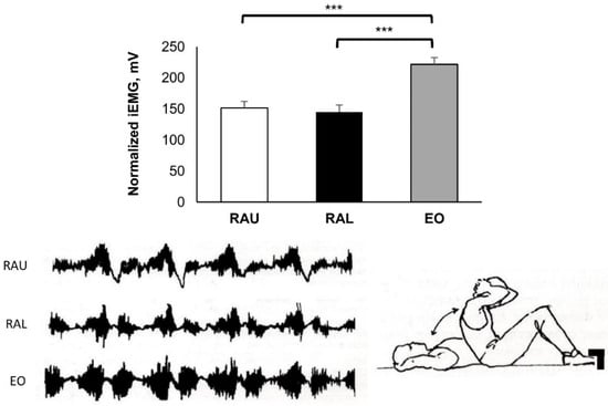 In Figure 7, it can be seen that the RAU and RAL had similar activity during curl-ups with lateral rotation to the left and right, regardless of which direction the lateral rotation followed. This was expected, as the RAL remained still on the floor. The difference observed between the RAU and the EO only during the right lateral rotation may be due to variance of the participants’ trunk mobility. Our results are in agreement with previous studies with similar methodological approaches [34,35].