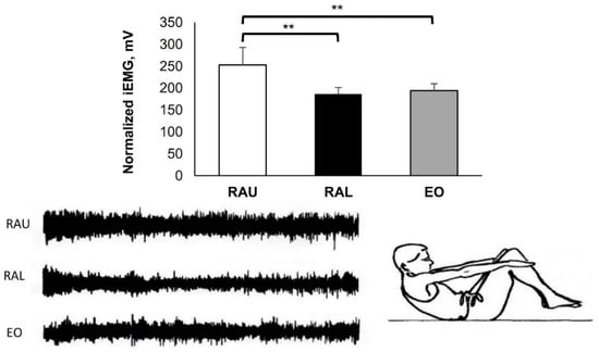 Hook lying with arms elevated forward and feet above the floor. Slow curl-up with rounded back to approximately 35–40°, with isometric contraction for 10 s. Group mean electric activity during the exercise. iEMG indicates surface electric activity. Raw EMG activity of the three muscles from one participant. RAU = rectus abdominis upper part; RAL = rectus abdominis lower part; EO = external oblique. Differences between muscles: ** p < 0.01.