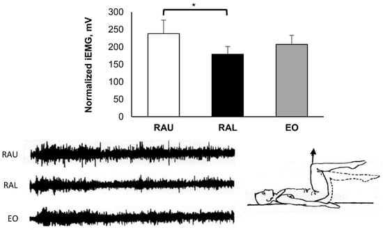 In the exercise shown in Figure 6, the behavior of EMG activity was completely different among subjects and the RAU (238.17 ± 38.76 mV) was higher compared with the RAL (179.10 ± 21.87 mV; p = 0.011).