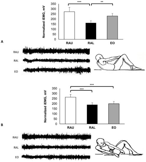 Supine position with bent knees and no stabilization of the lower limbs. Rotation of the trunk to (A) the left and (B) the right side of the body with isometric contraction for 10 s. The surface electrodes were placed on the right side of the external oblique muscle. Group mean electric activity during the exercise. iEMG indicates surface electric activity. Raw EMG activity of the three muscles from one participant. RAU = rectus abdominis upper part; RAL = rectus abdominis lower part; EO = external oblique. Differences between muscles: ** p < 0.01; *** p < 0.001.