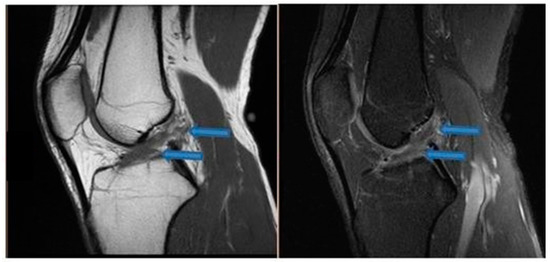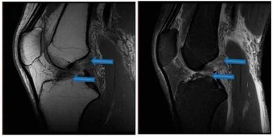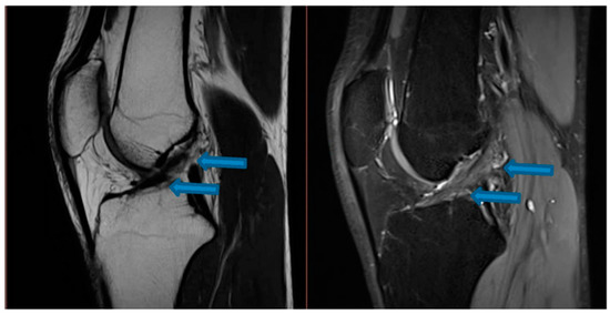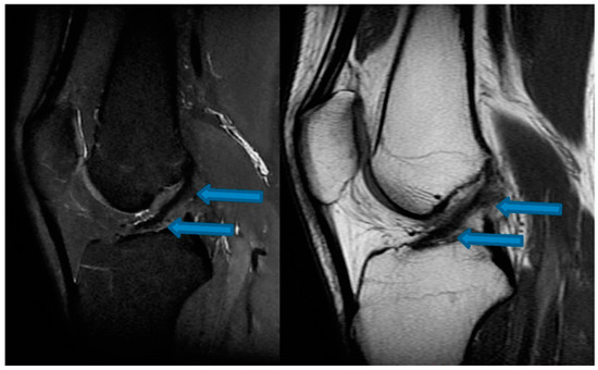 Sagittal T1- and T2-weighted magnetic resonance imaging of the knee demonstrating ACL detachment at the femoral origin indicated by blue arrows (20 July 2020).