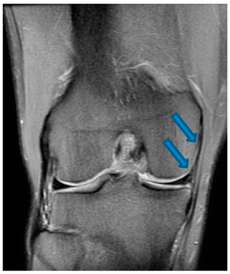 Coronal T2-weighted magnetic resonance imaging of the knee demonstrating injury of the medial meniscus and MCL indicated by blue arrows (20 July 2020).