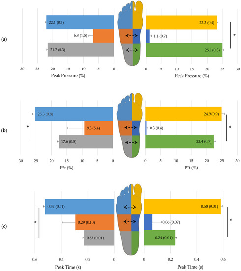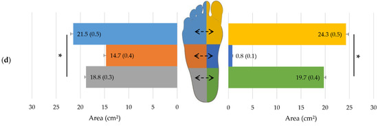 (a) Peak pressure, (b) P*t, (c) Peak time and (d) Area mean (and standard error) [computed for covariates at their means: age = 42.5 yrs] of each specific pressure zone; computed on all subjects (n = 170). Asterisks (*) denote statistical significances between forefoot and rear-foot plantar pressure zones in the lateral or medial part of the foot. Significant differences between lateral and medial pressure zones of fore-, mid- and rear-foot are indicated by dashed arrows in the drawn footprint (p < 0.05).