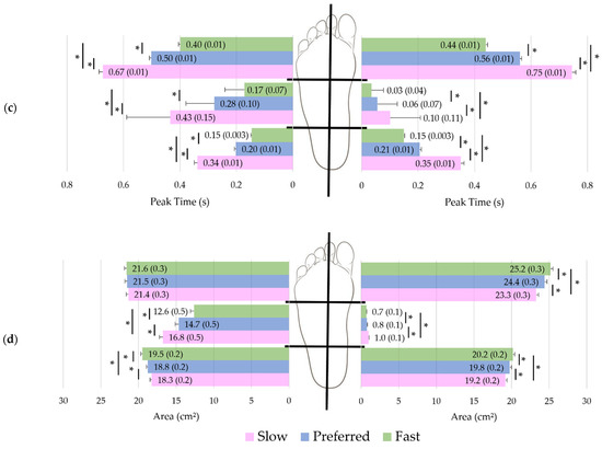 For each define pressure zone, (a) Peak pressure, (b) P*t, (c) Peak time and (d) Area mean (and standard errors) [computed for covariates at their means: age = 42.5 yrs] at each specific walking speed (from bottom to top): slow velocity results are in pink, preferred in blue, and fast in green. Results are computed on all subjects (n = 170). Asterisks (*) denote statistically significant differences between velocities within each plantar pressure zones (p < 0.05).