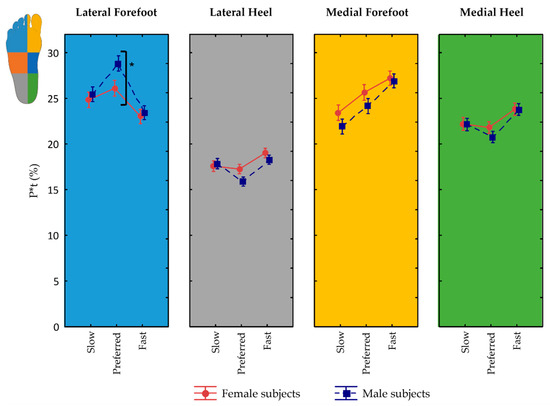 However, the effect of velocity on peak pressure and P*t in the different plantar pressure zones was mainly observed in male participants (p ≤ 0.04, part. η2 = 0.02) where greater variation in peak pressure and P*t with increased or decreased walking speed were present. Instead, women showed increased peak pressure and P*t in the medial forefoot only when they increased walking speed from slow to preferred (p ≤ 0.006). Moreover, greater peak pressure in the lateral heel (p = 0.04) and reduced P*t in the lateral forefoot (p < 0.001) were observed only at fast speed.