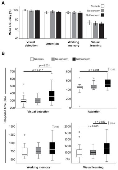 Assessments of cognitive function generally rely on a performance ‘outcome’, and these can be binary (such as correct detection of something or not), or they can be continuous or additive (such as the number of errors made during a given test) []. However, as illustrated by Cunningham et al. [], reliance on test outcome measures may not detect subtle impairments, particularly in single testing sessions, that reflect self-reported concerns. This implies that the current objective testing regimes that rely purely on outcome measures are insufficient in measuring subtle cognitive processing abilities [,].