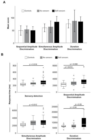 Like cognitive testing, somatosensory testing using Cortical Metrics showed no difference in the mean score between groups (Figure 2A), but again, response times were consistently longer in the self concern group (Figure 2B). Specifically, there were significantly delayed reaction times in sensory detection, and response times for sequential amplitude, simultaneous amplitude, and duration discrimination, relative to the control group. Again, response times, not overall scores, were significantly positively correlated with fatigue scores (Table 3).