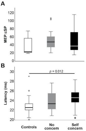 Differences among groups were also found during transcranial magnetic stimulation (TMS). While the median MEP:cSP ratio (Figure 3A) was increased in ex-players both with self concern and no concern, compared to control (37.8 and 48.0 vs. 23.6, respectively), this did not reach statistical significance. However, MEP latency was significantly prolonged in the players with self concern relative to control (H(2) = 9.73, p = 0.008, n2p = 0.13; Figure 3B), suggesting the presence of damage to motor pathways in this group that cannot be discerned from MEP amplitudes alone. TMS latency was, like the response times of cognitive and somatosensory tests, significantly positively correlated with fatigue score (Kendall’s Tau B = 0.182, p = 0.024).