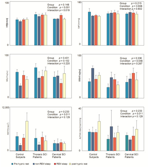 Table 1 depicts data derived from an autoregressive spectral analysis of RR and SAP variabilities in all the four considered conditions (pre-hypnic rest, NREM sleep, REM sleep, post-hypnic rest) in all three groups. The complexity of the protocol (four conditions) and the small number of subjects in the three groups limited the possibility to observe significant results. Nevertheless (see also Figure 1), it was possible to observe a clear reduction in Heart Rate (HR) during NREM sleep and its increase during REM sleep, particularly in control subjects (condition p = 0.001; interaction p = 0.019), while non-significant changes were observed in SAP. Moreover, it was possible to observe signs of the expected sympathetic activation (expressed by higher RRLFnu and reduced RRHFnu) during REM sleep in control subjects, while this finding was not present in SCI patients. Alpha index (marker of overall cardiac baroreflex sensitivity) appeared to be greater in all three groups in the morning (condition p = 0.011). RRTP (total power or variance of RR interval variability) showed significant changes during the different considered conditions (condition p = 0.011) in all groups. RRHFHz, which reflects respiratory frequency, was significantly different in the considered conditions (condition p = 0.003) being slowest during NREM sleep in all three groups.