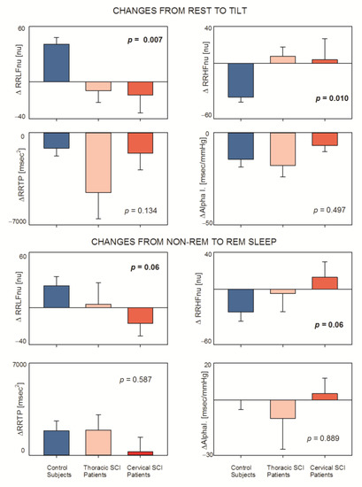 In spite of the small number of subjects, the individual location of SCI (Table 4) was strongly correlated to LF and HF changes only with the stronger stimulus produced by tilt and if expressed in nu. These differences were not present observing time domain indices such as RRTP and Alpha Index (derived from amplitude oscillations and proxy of cardiac baroreflex gain), which are surrogates of vagal tone and reflexes [30]. The same occurred considering the changes induced by tilt or by REM sleep, as expected considering that pathways followed by parasympathetic (vagal) fibers, that interconnect the medulla oblongata directly with the periphery, are not affected by SCI. Many studies in the literature have shown that time domain indices and indices of baroreflex gain reflect mainly parasympathetic control [30,43,46,47].