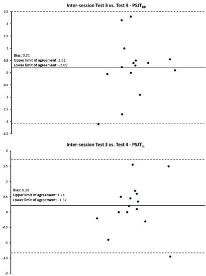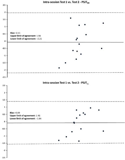 | Intrasession Test1 vs. Test2—PSJTRLEG | (1,13) = 360.06 | <0.001 | 0.963 |