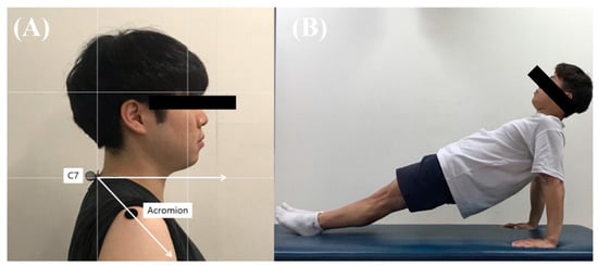 In this study, the sample size was set using G-Power software 3.1.3 (Christian-Albrechts-Universität Kiel, Kiel, Germany)(effect size: 0.5; err prob: 0.05; power (1-β err prob): 0.8; Total sample size: 34). Forty subjects were voluntarily recruited from a local university. Participants were divided into the FSP group (when the angle measured between the horizontal line of the C7 spinous process and the acromion process was below 52 degrees) and the non-forward shoulder posture (NFSP) group (when the angle exceeded 52°) [29]. The FSP and NFSP groups consisted of 5 males and 15 females, respectively. Inclusion criteria were as follows: (1) no interventions done for FSP within the last 6 months, (2) no history of balance disorders or musculoskeletal pathologies (such as a history of shoulder surgery or cervical or thoracic fractures), and (3) ability to perform the reverse plank exercise. The purpose and procedures were explained, and the participants provided written informed consent to participate in the study. Ethical approval was obtained from the Institutional Review Board of Dankook University (2019-11-016-002).