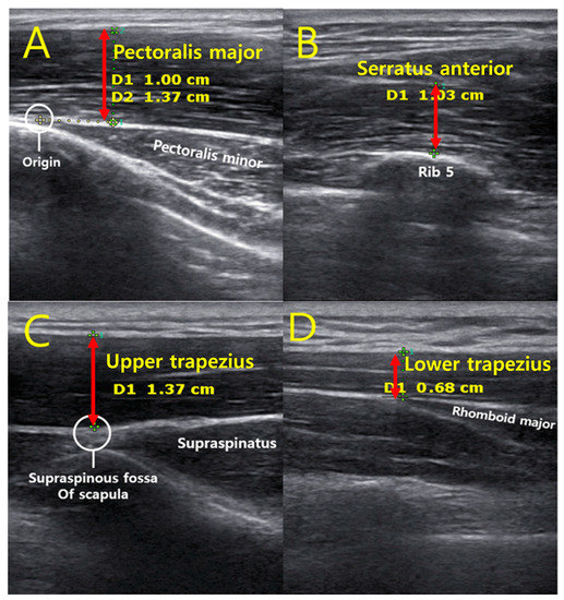 Ultrasound images of the anatomical landmarks and thickness of each muscle; (A) Pectoralis major, (B) Serratus anterior, (C) Upper trapezius, (D) Lower trapezius.