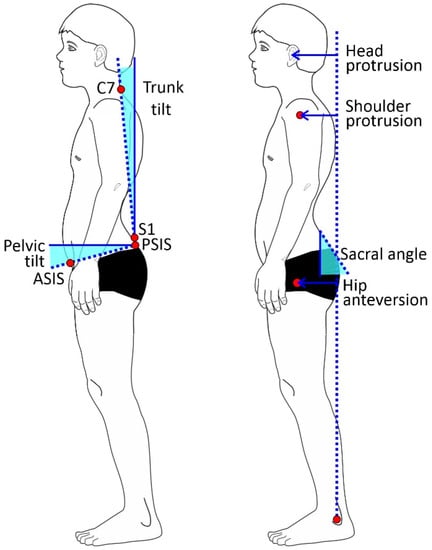 Using analysis software (Dartfish ProSuite 6, Dartfish, Fribourg, Switzerland), the following posture parameters were determined (Figure 1): horizontal distances of the ear, shoulder (acromion), and hip (major trochanter) perpendicularly through the lateral malleolus as a percentage of body height; pelvic tilt (angle between the connecting the PSIS–ASIS line to the horizontal); and trunk forward tilt (angle between the connecting the S1–C7 line to the vertical).