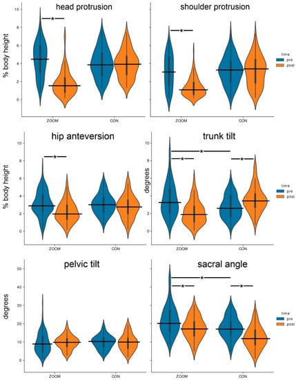 Violin plots of the development of the posture parameters of the training group (ZOOM) and the control group (CON). The horizontal lines mark the median, * = significant difference (p < 0.05).