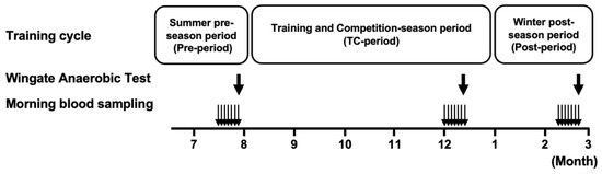 An overview of the experimental design of this study is presented in Figure 1. The training period cycle was divided into (1) a summer pre-season period (Pre-period: 2021, July), (2) a training and competition-season period (TC-period: 2021, August–December), (3) a winter post-season period (Post-period: 2022, January–March).
