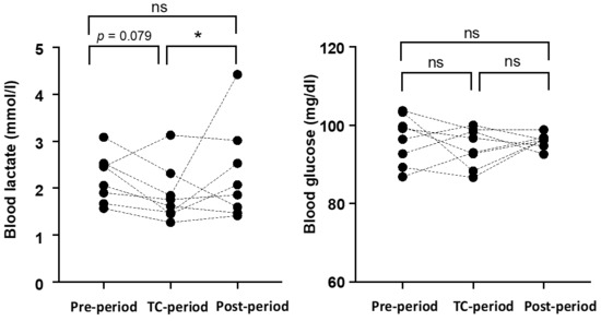 The changes in resting La− and blood glucose levels measured continuously for one week in each period are shown in Figure 2. The resting La− level during the TC-period (1.9 ± 0.6 mmol/L) was lower than that during the Post-Period (2.3 ± 0.9 mmol/L, p = 0.024) and tended to be lower than during the Pre-period (2.2 ± 0.5, p = 0.079). The resting blood glucose levels did not change among periods (Pre-period: 96.4 ± 6.1 mg/dL, TC-period: 94.3 ± 4.8 mg/dL, Post-period: 96.0 ± 1.7 mg/dL).