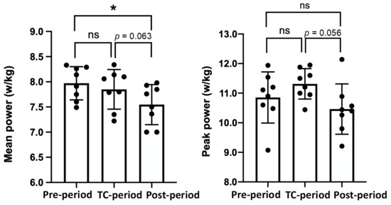 The results of the 40-s WT (average and peak power) are shown in Figure 3. There were no significant differences in the 40-s WT results between the Pre-Period and the TC-Period. The mean power values in the Post-Period were lower than in the Pre-Period (−5.3%, p = 0.006) and tended to be lower than in the TC-Period (−3.8%, p = 0.063). The peak power tended to be higher in the TC-Period than in the Post-Period (p = 0.056), but there was no significant difference among the three periods.